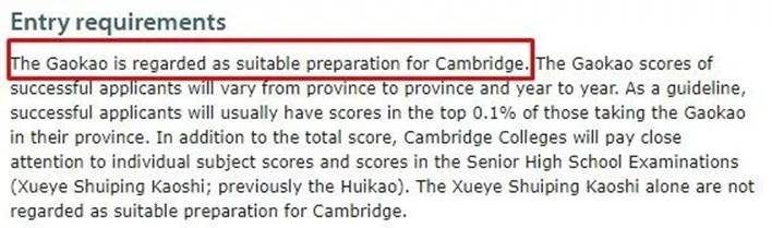 中国高考是剑桥大学认可的考试。高考分数达标的考生(也就是本省的top 0.1%),就可以考虑填报剑桥大学哟!