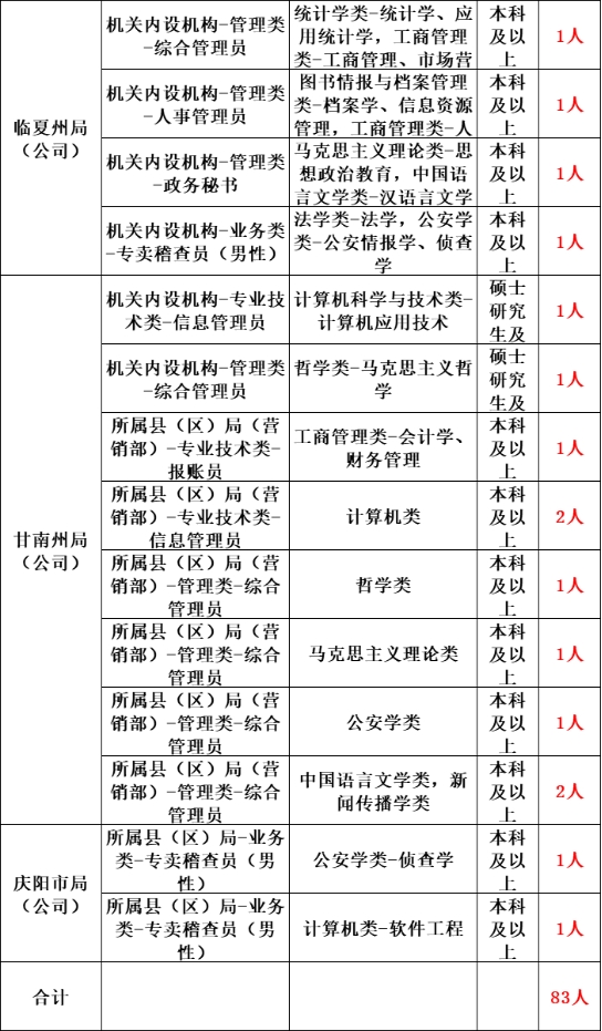 因工作需要,甘肃省烟草专卖局(公司)计划公开招聘2021年应届高校毕业生83名。