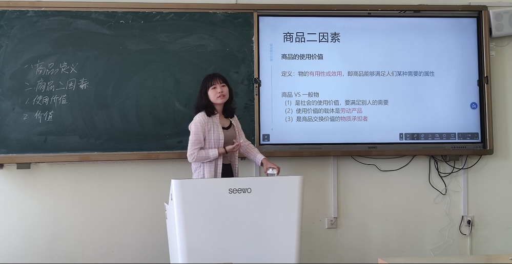 王婉琦老师本学期主讲政治经济学,评课活动选择商品的价值。她对商品价值的概念进行了详细的解释,并通过实例和案例进行了生动的说明。王婉琦老师在准备方面做得充分,态度大方、自然。
