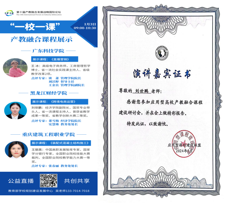 “一校一课”产教融合示范课程展示活动自启动以来,共有百所院校积极参与,经专家评委会评审遴选,共有 36 门课程入选,我校经济学院副院长刘世鹏老师主讲的《跨境电商运营》课程通过专家评审入选展示,并被择优推荐在应用型高校产教融合课程建设研讨会上做了“师说课改”的分享。