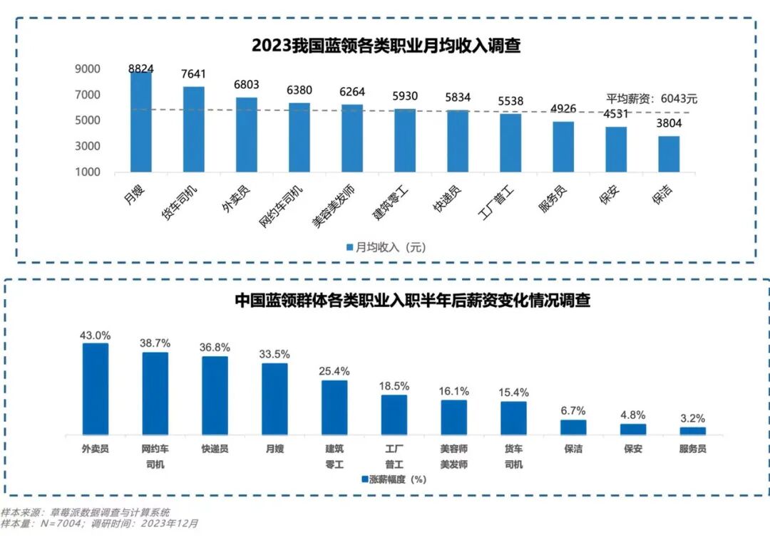 根据中国新就业形态研究中心发布《2023中国蓝领群体就业研究报告》,外卖员的月均收入为6803元,比建筑零工、工厂普工高出900到1200元左右。同时,外卖员、网约车司机和快递员,入职半年后的薪资涨幅均超过36%,比建筑零工、工厂普工高出超10%,