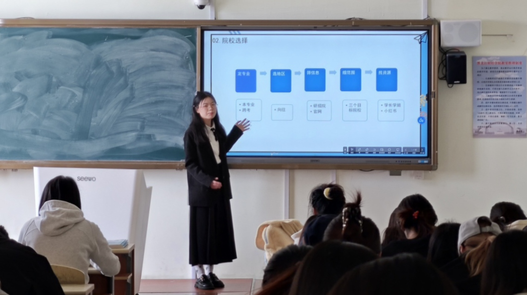 2021级财务管理专业六班黄思雨同学。她分享了自己的考研之路,详细讲述了自己考研目标确定的过程,建议同学们结合自身兴趣、专业优势以及未来职业规划,筛选出适合自己的院校和专业,可参考各高校历年的报录比、专业排名等数据,让目标设定更具科学性,多关注考研相关资讯,包括报名时间、考试大纲变化等,避免因信息差而影响考研进程 。 同时还分享了她面对备考压力的心态调整方法。他表示,压力大时会和研友交流,互相打气,也会适当进行运动、听音乐来放松身心。
