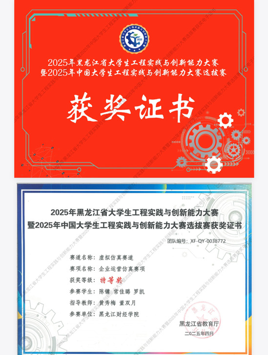 2025年黑龙江省大学生工程实践与创新能力大赛企业运营仿真赛项的比赛于3月29日在哈尔滨商业大学成功举办,本次大赛由黑龙江省教育厅主办,哈尔滨商业大学承办。本赛事吸引了来自哈尔滨工业大学、东北林业大学、黑龙江大学等全省35所高校、278支队伍、超千名学子同场竞技。我院由黄秀梅、董双月两位教师指导,陈镛、常佳璐、罗凯三位同学组成的团队,以敏锐的商业洞察力和高效的团队协作,制定精准的企业运营策略,在复杂的商业环境中突出重围,最终斩获企业运营仿真赛项省级特等奖。