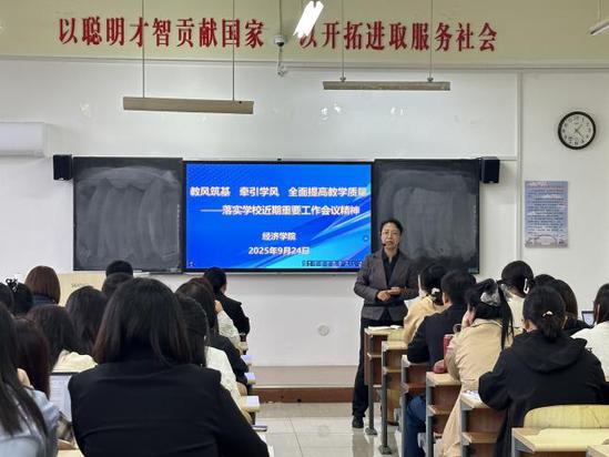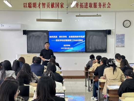 2025年9月24日,经济学院为落实学校近期重要工作会议精神,组织全体教师召开以“教学筑基·牵引学风·全面提高教学质量”为主题的工作会议,系统部署教风、学风建设及就业保障相关工作,会议由副院长刘世鹏主持,董雪梅院长、王超书记分别作工作部署讲话。