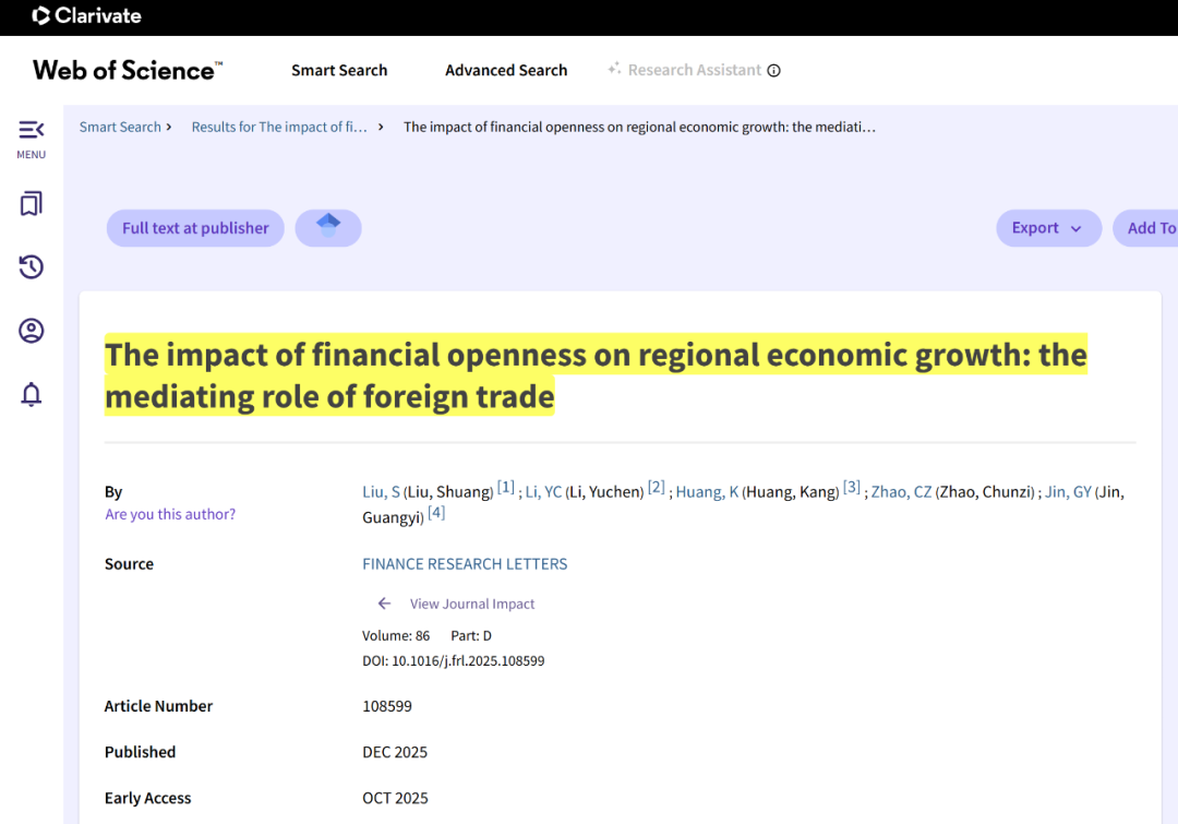 近日,我校经济学院刘爽老师的最新研究成果——论文《The impact of financial openness on regional economic growth: the mediating role of foreign trade》(中文名:金融开放对区域经济增长的影响——以对外贸易促进为中介变量)在国际核心学术期刊《Finance Research Letters》(中文名:《金融研究快报》)上正式发表。该期刊被SSCI和SCIE收录,JCR分区在Business/Finance领域位于Q1区,属于中科院“经济学”大类2区期刊。该期刊主要发表金融领域原创性研究成果,涵盖资产定价、公司金融等方向,在国际经济学领域有广泛影响力。